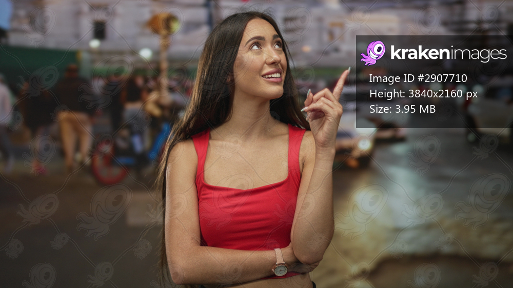 Woman points finger upward on a busy city street in a red crop top showing bare hand and shoulder; cheerful curiosity.