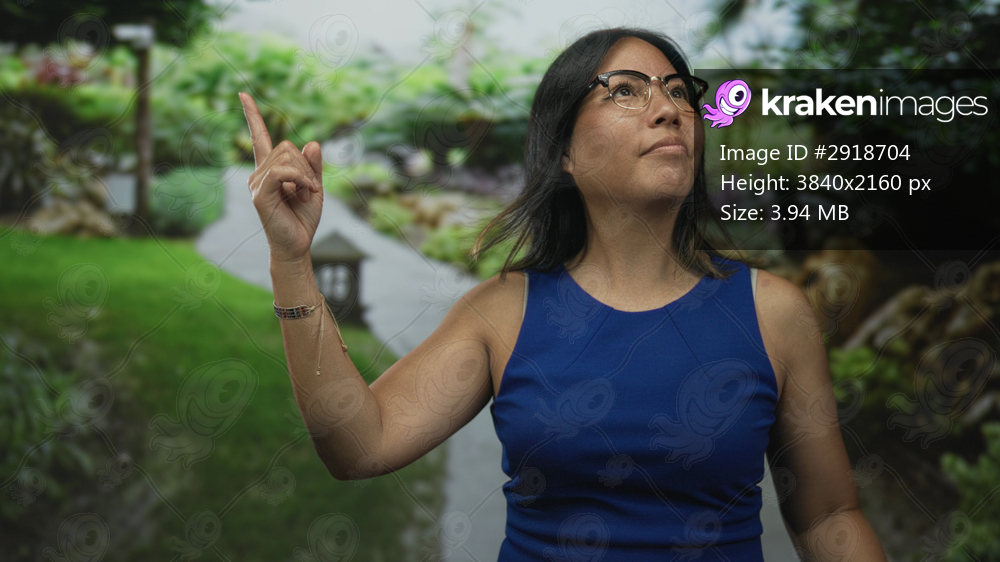 Woman points finger upward on a forest path beside a lantern, wearing blue sleeveless dress and glasses; confidence focus.