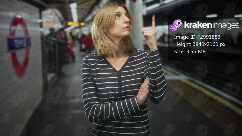 Woman points finger upward on a subway platform inside a building, wearing a striped longsleeve shirt, arms crossed and gazing up; curiosity waiting.