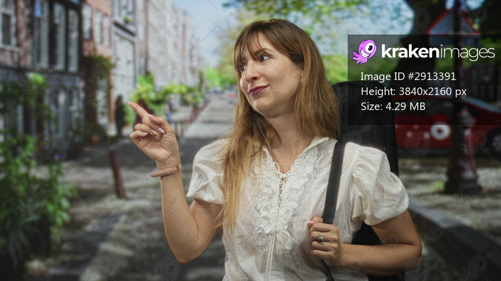 Woman points finger upward on a sunlit city street holding backpack strap and smiling while looking to the side; travel confidence playful.