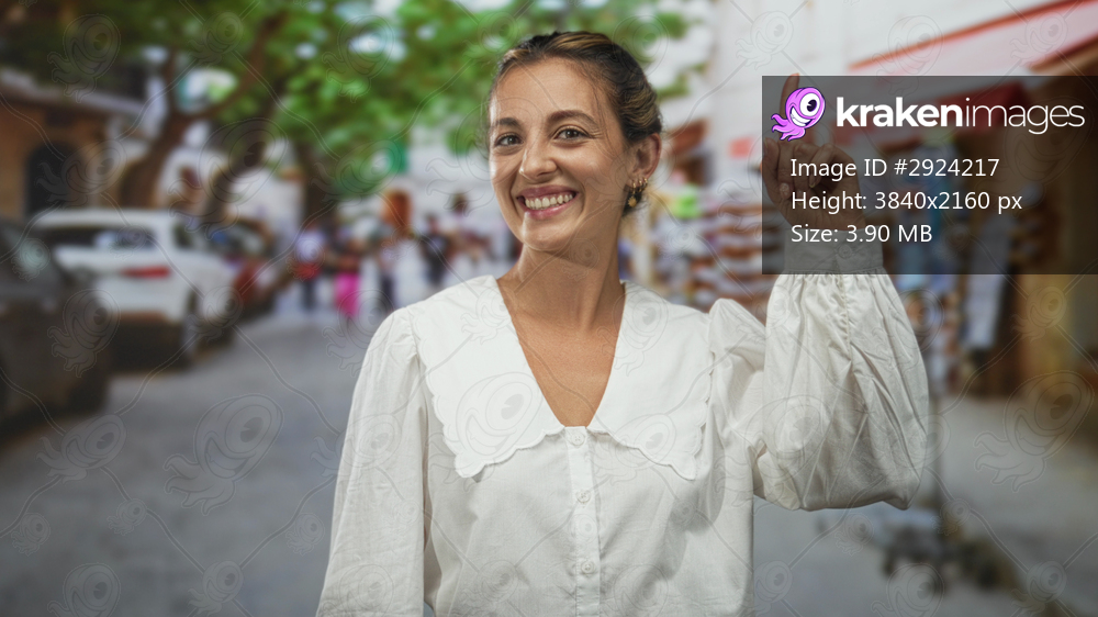 Woman points finger upward on street wearing a white shirt and smiling, hand raised beside parked car and shop awning; friendly smile.