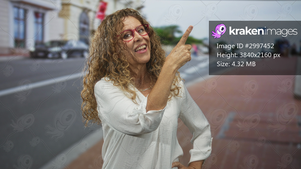 Woman points finger upward on street wearing red glasses and a white blouse, hand on hip and skeptical expression; skepticism curiosity.