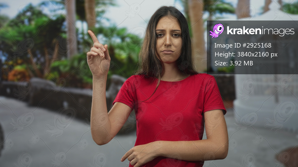 Woman points finger upward with raised hand and visible forearm, wearing red t shirt in an outdoor street scene with palm trees and white gazebo; uncertainty. - Kraken Images