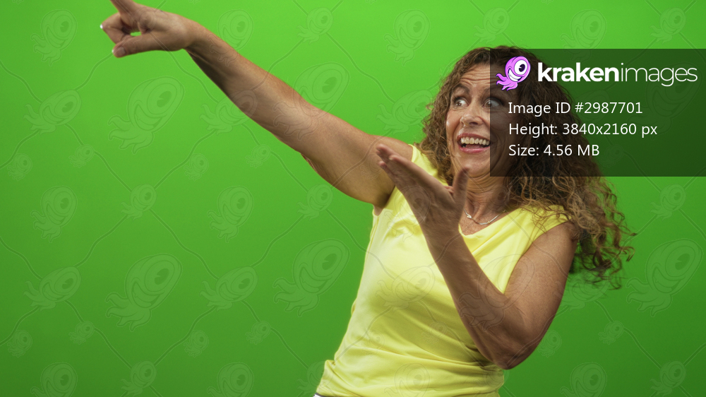 Woman points finger upward, smiling with hand on hip and yellow sleeveless top in studio; joy playfulness.