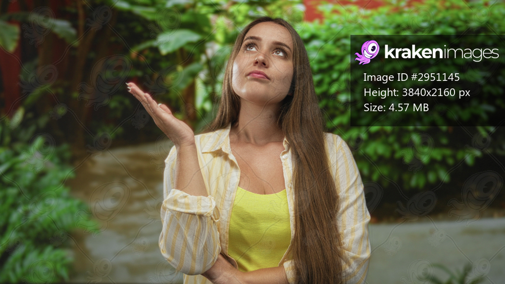 Woman points finger upward and tilts her head while looking skyward in a forest setting wearing a yellow top and striped shirt with long hair; curiosity thoughtful. - Kraken Images