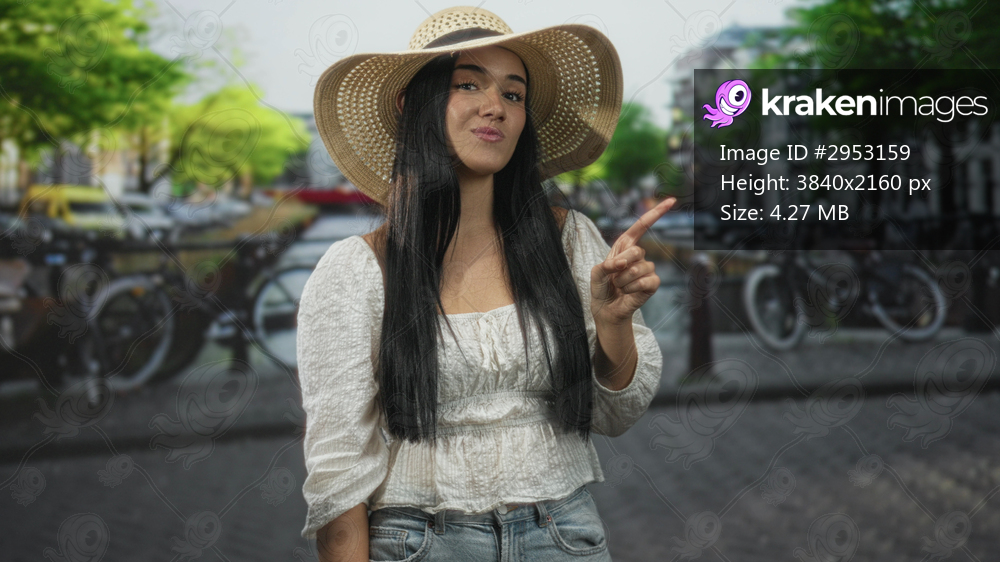 Woman points finger upward while wearing a straw sunhat and white blouse on a cobbled street by a canal with parked bicycles; cheerful travel.