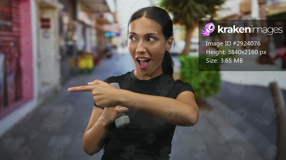 Woman points finger while holding a dumbbell on a bustling city street with storefronts and a car visible; playful.