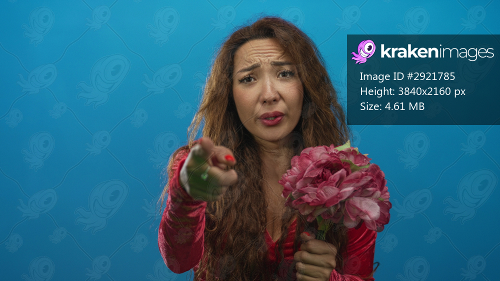 Woman points finger while holding a pink bouquet of flowers and wearing a red dress in a blue studio; pleading apology.