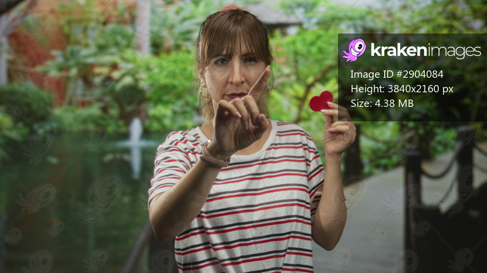 Woman points finger while holding a small red heart near chest on park walkway by green pond and bridge; love longing.