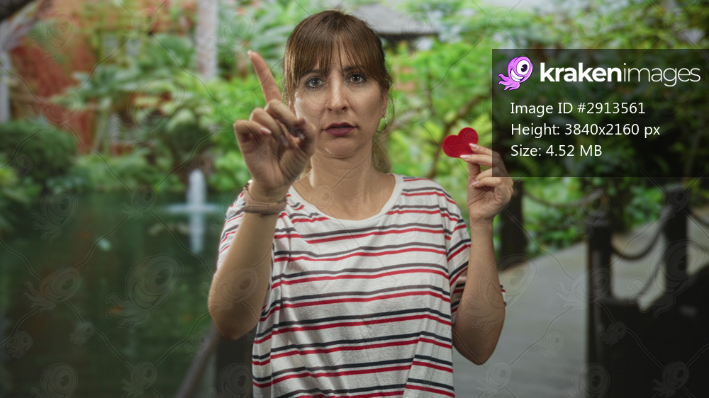 Woman points finger while holding a small red heart near chest on park walkway by green pond and bridge; love longing.