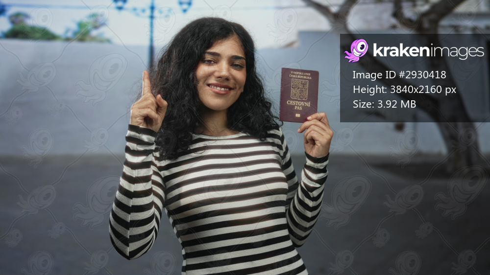 Woman points finger while holding czech passport on a city street, wearing striped top and smiling face; travel pride.