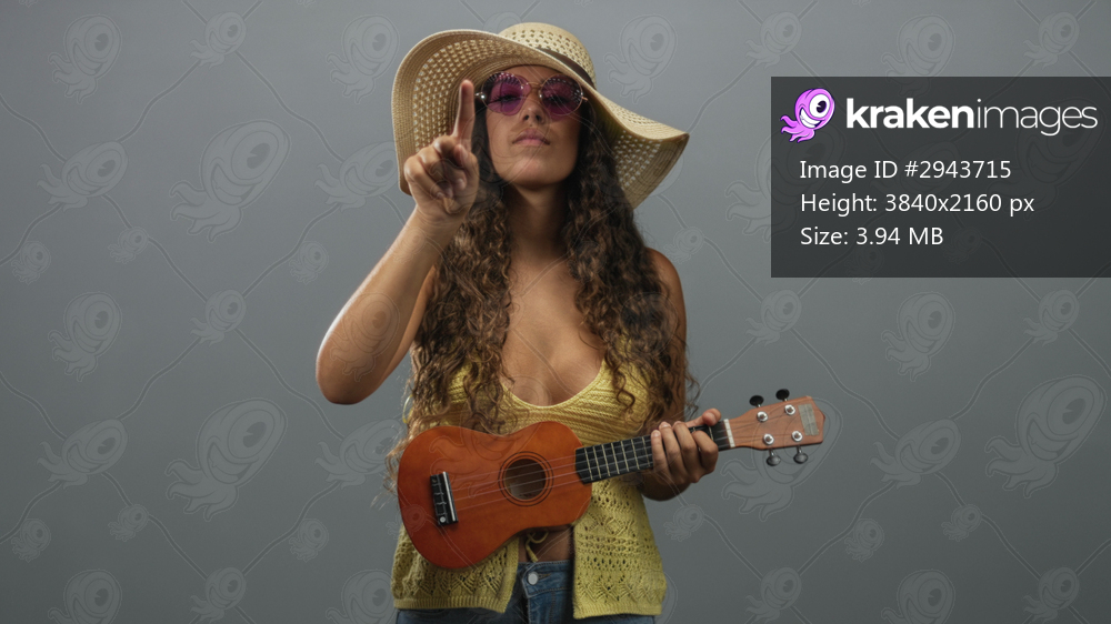 Woman points finger while holding ukulele in studio, sun hat and sunglasses; confident summer music.