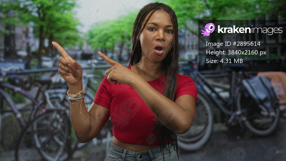 Woman points fingers with bare hands at parked bicycles on a canal street in amsterdam, red top and denim jeans, braided hair visible; surprise travel discovery. - Kraken Images