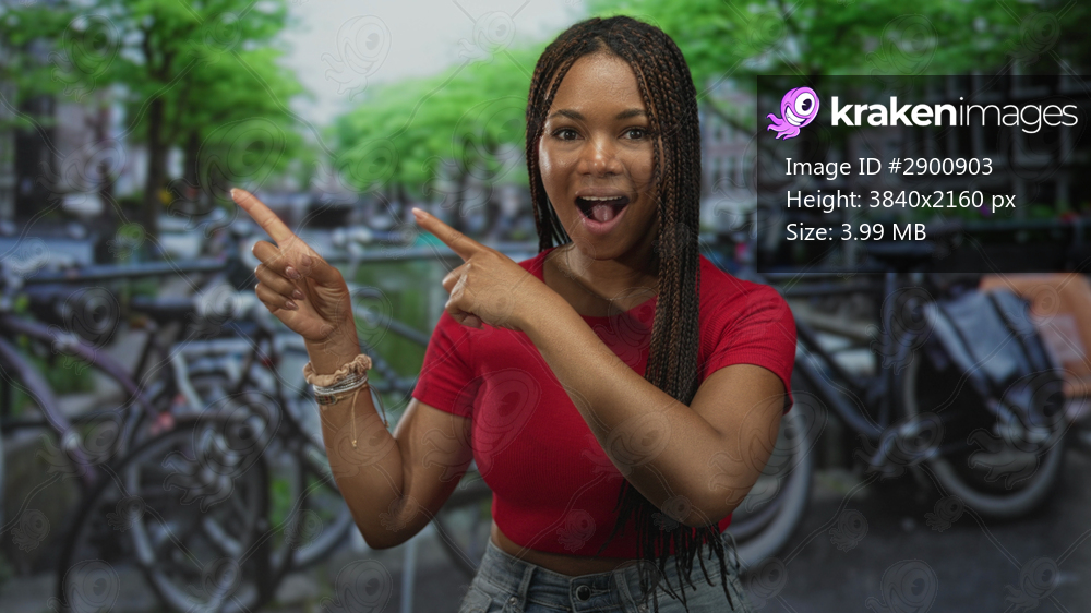 Woman points fingers with bare hands at parked bicycles on a canal street in amsterdam, red top and denim jeans, braided hair visible; surprise travel discovery. - Kraken Images