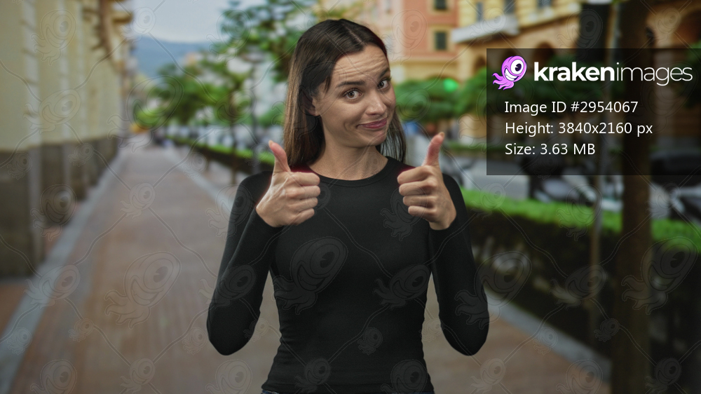 Woman points fingers and flashes thumbs up with open palms while smiling on a pedestrian city street lined with trees and buildings; playful approval.