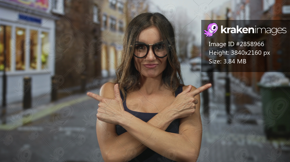 Woman points fingers to both sides on street, wearing navy tank top and large round glasses, visible shoulders and chest, playful grin; playful curiosity. - Kraken Images
