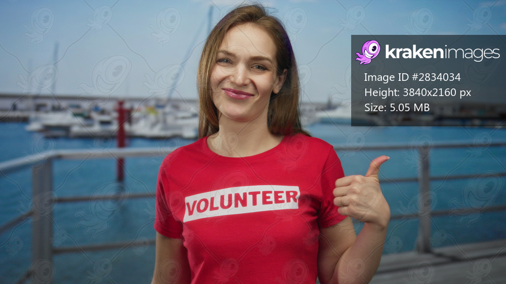 Woman points fingers to bright red volunteer shirt at seaside port; pride volunteering community service.