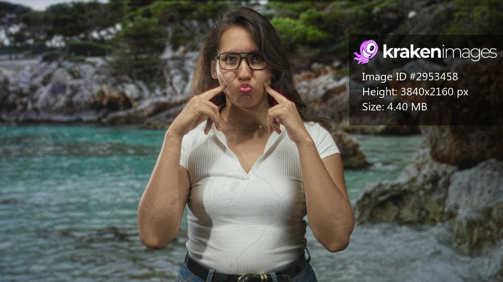 Woman points fingers to cheeks in studio with turquoise seaside rocks visible, wearing glasses and white shirt while smiling; playful joy.