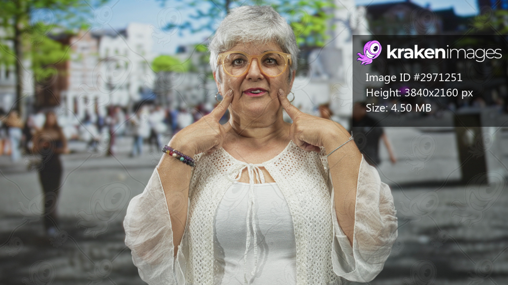 Woman points fingers to cheeks on street wearing glasses and white cardigan, smiling warmly while standing in an urban plaza; joy warmth.