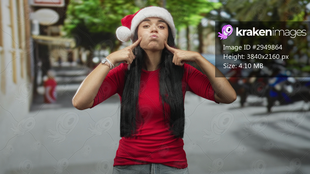Woman points fingers to cheeks and pouts wearing santa hat and red shirt on a street with motorcycles; playful holiday cheer.