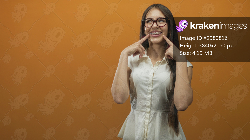 Woman points fingers to cheeks showing braces and glasses in an orange studio, smiling with hands at hips in playful poses; playful confidence.