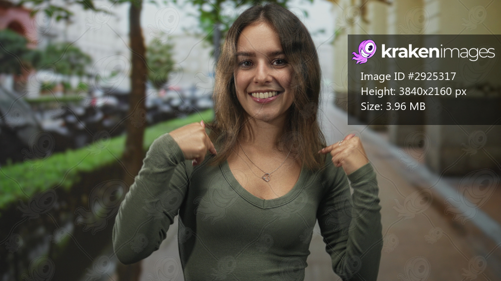 Woman points fingers to heart necklace on a city street smiling with a playful grin; confidence empowerment.