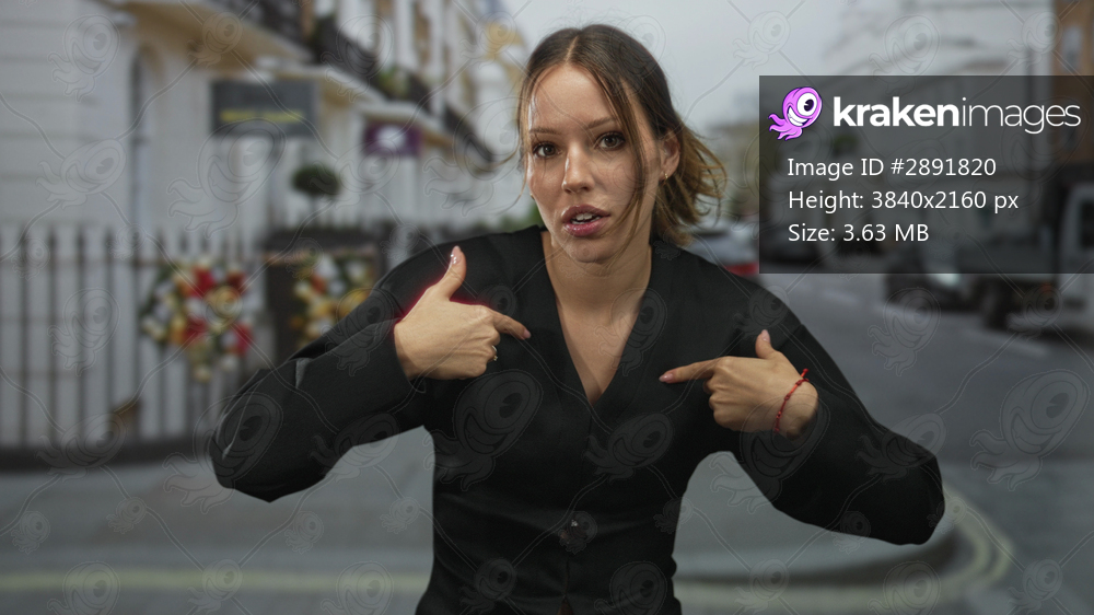 Woman points fingers to her chest on a city street with cars and buildings visible; self accusation annoyance.