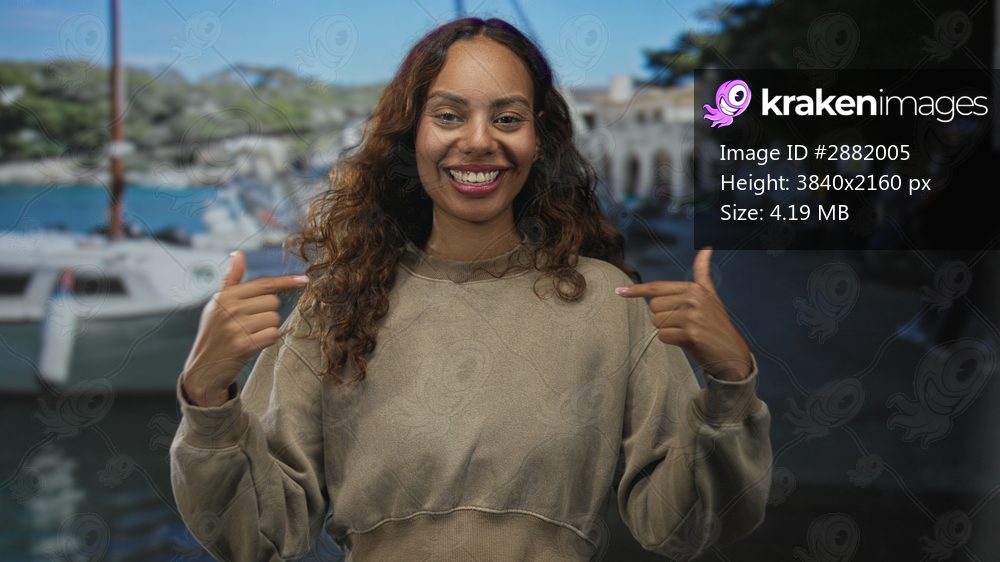 Woman points fingers to herself on a street with boats at a seaside port, smiling broadly; self confidence.