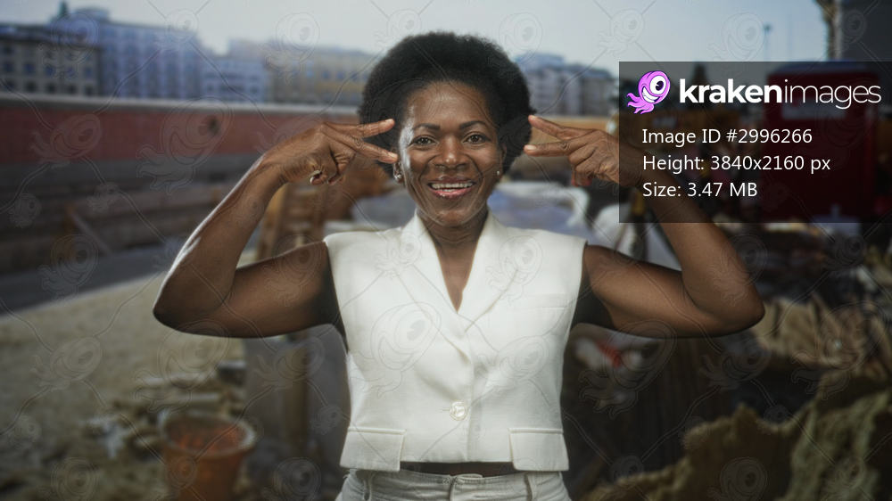 Woman points fingers to temples and shows flexed arms on a street construction site wearing a white sleeveless vest; confidence.