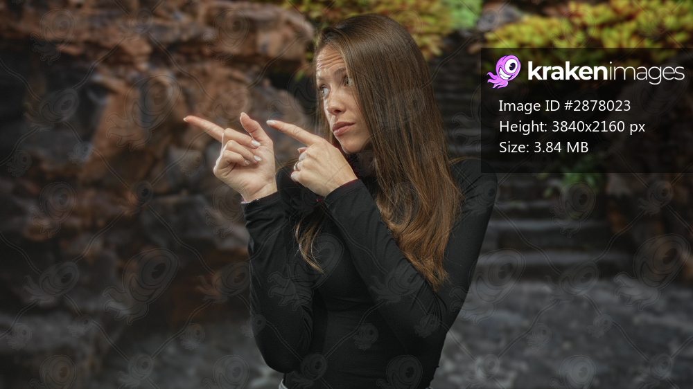 Woman points fingers to the left on stone stairs in a forest, showing visible nails and black longsleeve; playful curiosity.