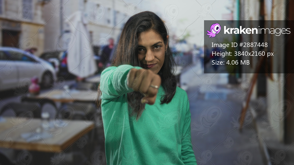 Woman points fist at camera on a street terrace near cafe tables and parked cars; defiance challenge assertiveness.