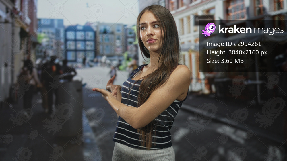 Woman points hand toward a street cafe with bare arm visible, gesturing and smiling while standing on a busy city sidewalk among storefronts and pedestrians; confident curiosity. - Kraken Images
