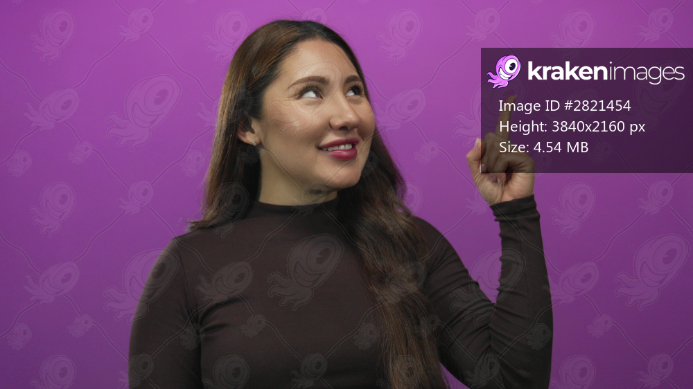 Woman points her finger upward in purple studio with smiling expression and upward gaze; inspiration.