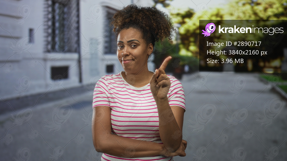 Woman points index finger with arms crossed, standing on city street in front of building, wearing striped tshirt and hoop earring; skepticism.