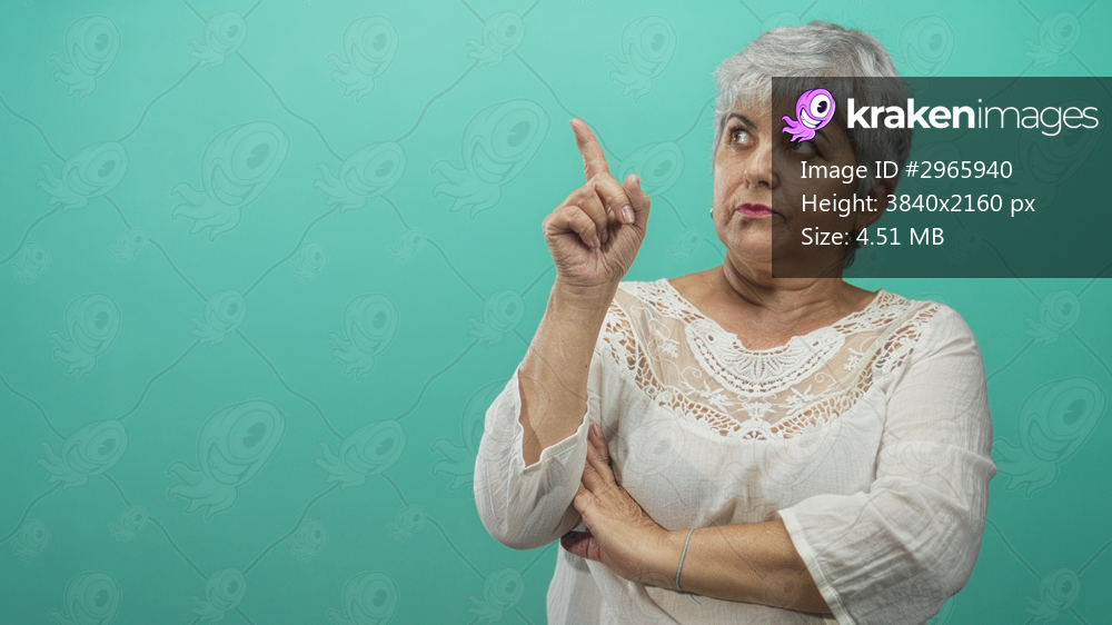 Woman points index finger with crossed arm and raised eyebrow in studio teal backdrop; thoughtful resolve.
