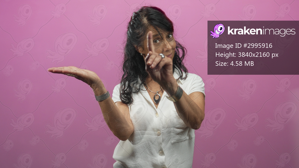 Woman points index finger and holds open palm forward in studio, wearing white blouse and pendant; firm caution.