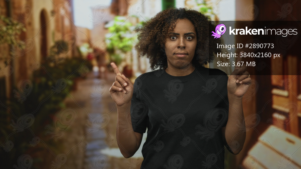 Woman points index finger in street wearing black tshirt, face visible; uncertainty caution hesitation.