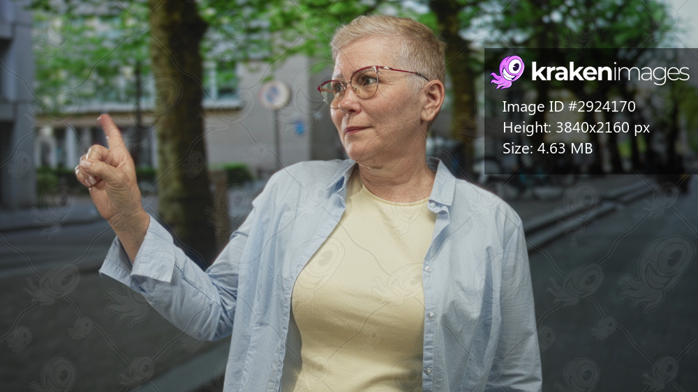 Woman points index finger on a city street, looking sideways with glasses and short buzzcut, wearing a light shirt; determination.