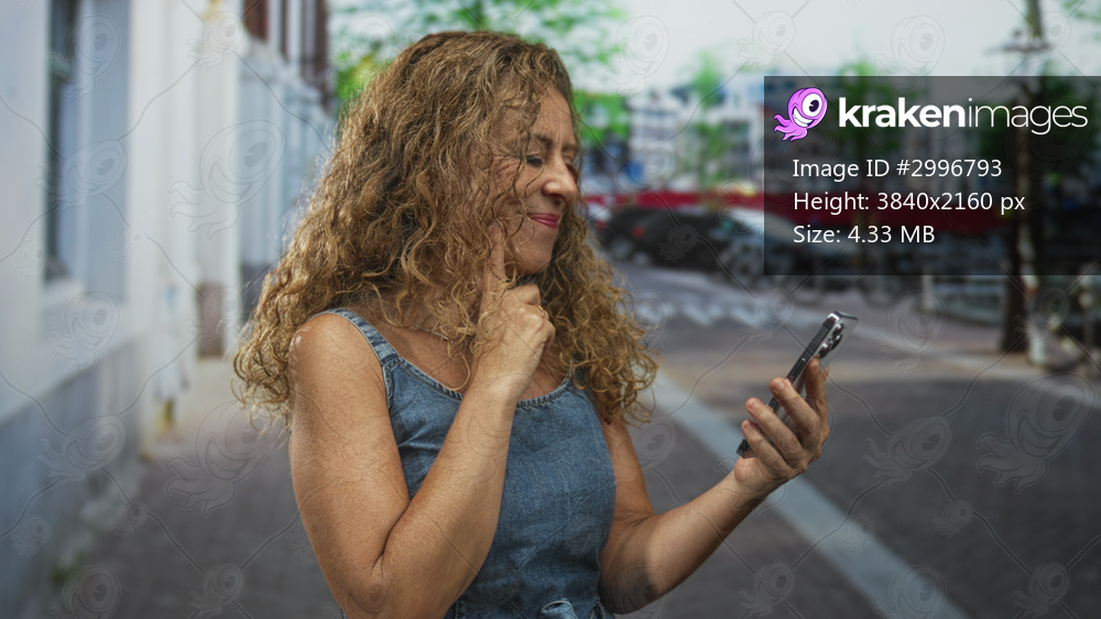 Woman points index finger to smartphone on street, tapping screen and smiling while checking messages; lighthearted joy.