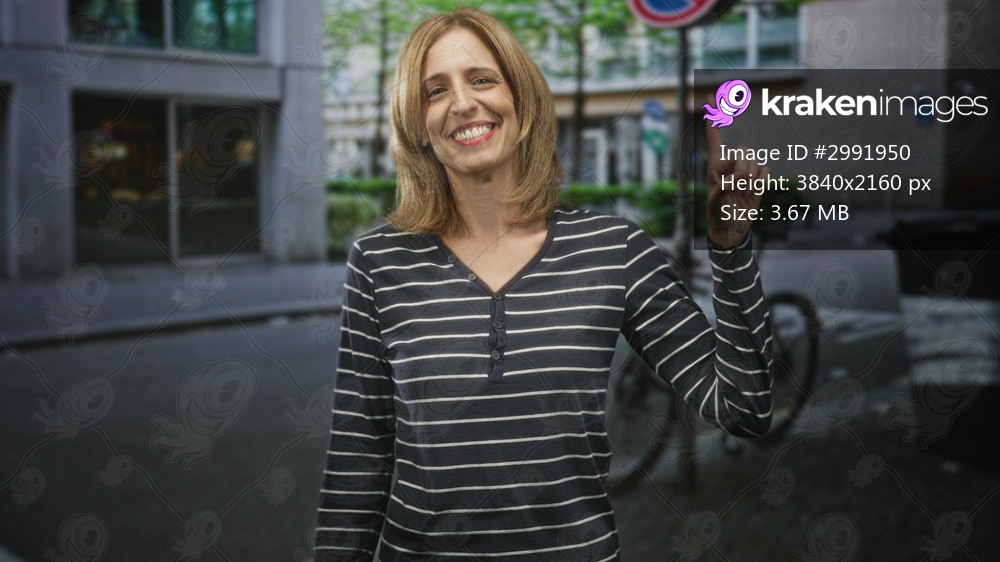 Woman points index finger up on urban street in front of an office building by a bicycle rack and no parking sign; cheerful direction.