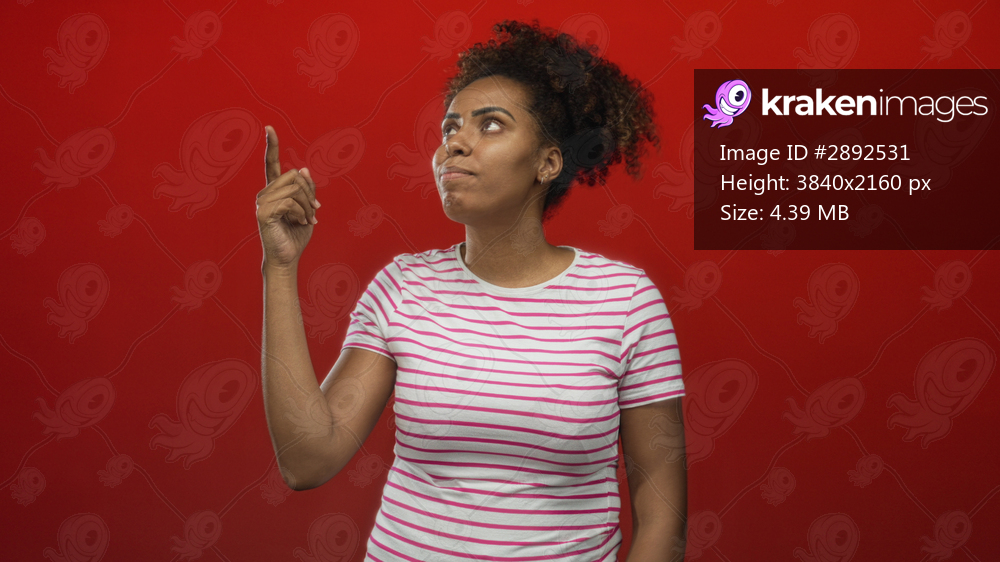 Woman points index finger upward in studio with red backdrop, wearing white tee with pink stripes and looking up; curiosity reflection.