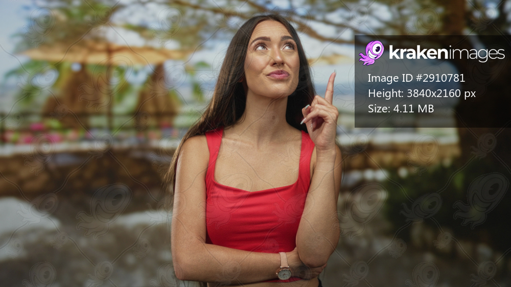 Woman points index finger upward on a restaurant terrace with crossed arms and exposed shoulders, red sleeveless garment; confidence.