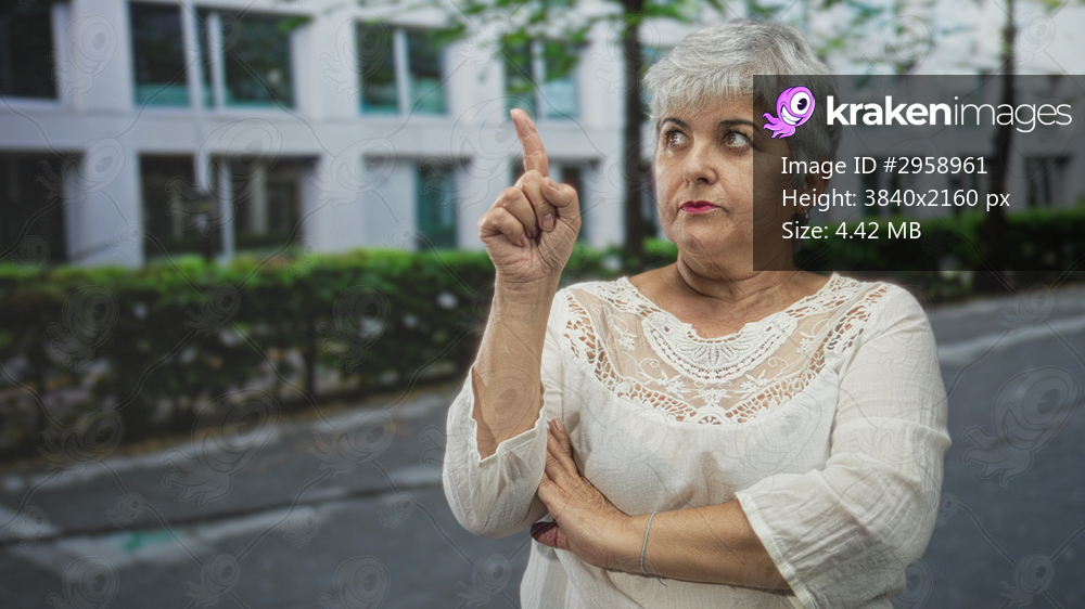 Woman points index finger upward on a street by a modern building with hedges, arms crossed, wearing white lace blouse and stern expression; firm disapproval. - Kraken Images