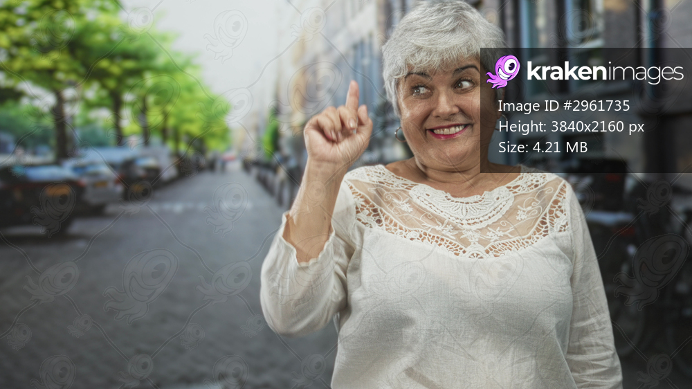 Woman points index finger upward on city street near parked cars wearing white lace top and smiling; joy confidence.