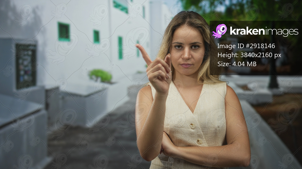 Woman points index finger upward on street in front of white building, arms crossed with bare shoulder visible, direct gaze at camera; confidence warning. - Kraken Images