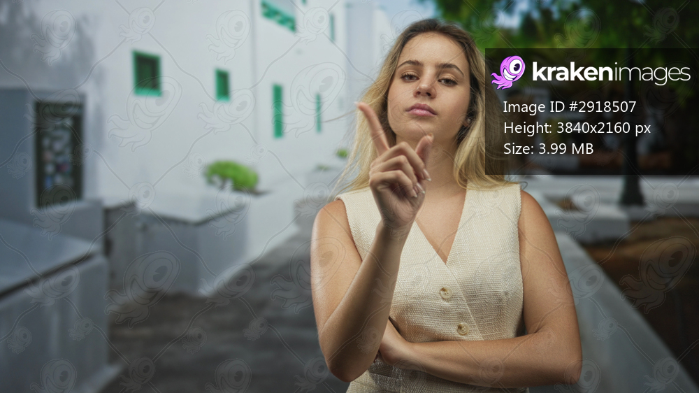 Woman points index finger upward on street in front of white building, arms crossed with bare shoulder visible, direct gaze at camera; confidence warning. - Kraken Images