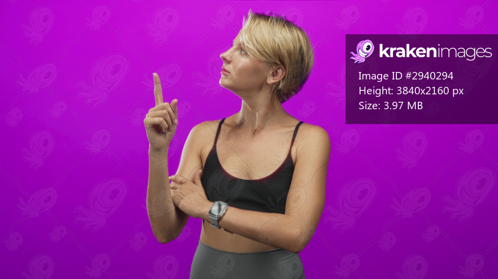 Woman points index finger upward with visible smartwatch and sports bra in studio; confidence focus pose.