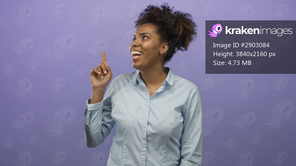 Woman points index finger upward while smiling in purple studio wearing light blue shirt and natural hair pulled up; joy inspiration optimism.