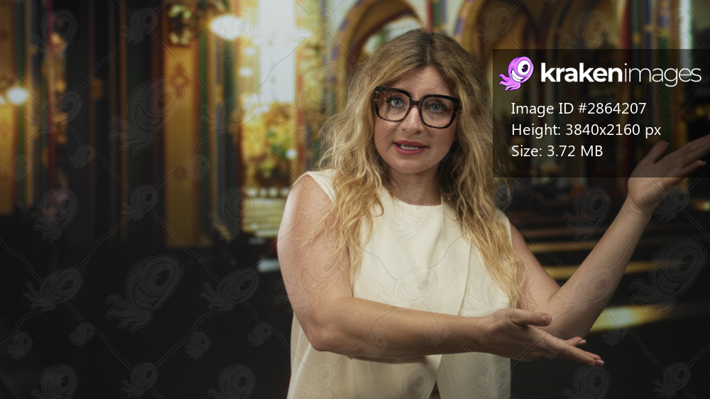 Woman points index fingers down in church building, wearing sleeveless white top and glasses; serenity reflection.