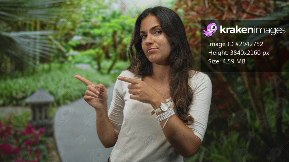Woman points index fingers to the left on a park path with visible wristwatch and bracelets; playful curiosity.